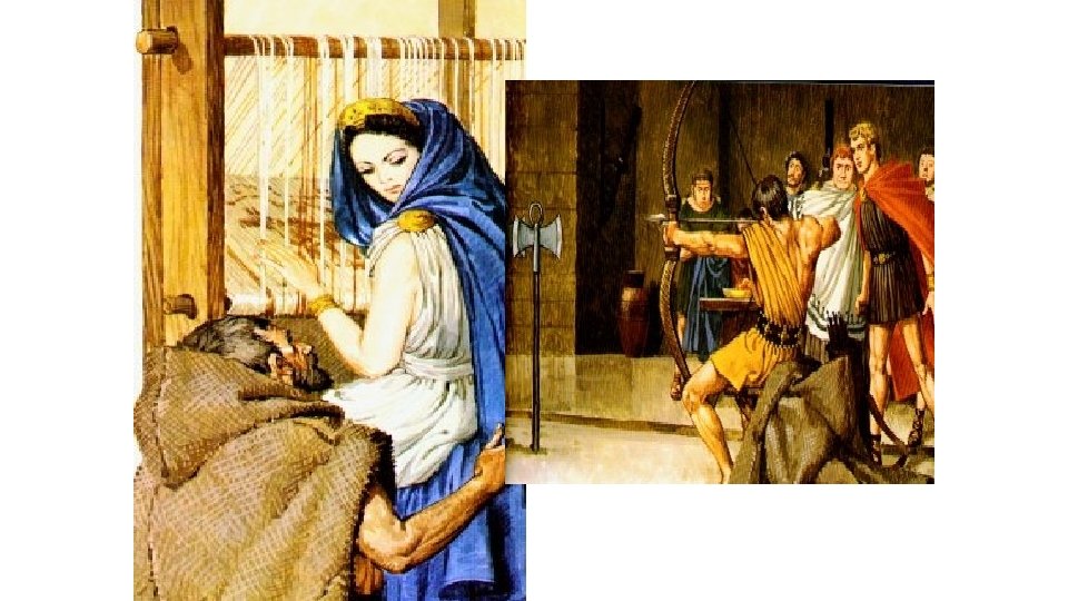 • Non aveva ancora visto una cosa che l’avrebbe sorpreso e fatto arrabbiare. L’allevatore di porci lo portò alla reggia in cui vivevano i Proci: persone prepotenti che volevano prendere il posto di Ulisse. Sua moglie Penelope aveva organizzato una gara con l’arco di Ulisse: chi riusciva a infilare la freccia in dodici anelli l’avrebbe sposata.