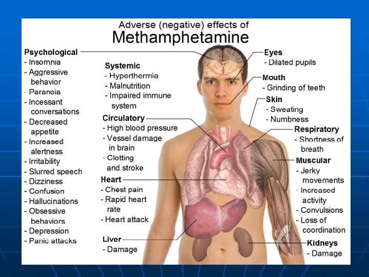 Effects: n n n Physical: tachycardia; hypertension; hypotension, hyperthermia; convulsions; heart attack, arterial wall vasoconstriction; bronchodilation; hyperglycemia; PE; Pulmonary Hypertension; Psychological: Lots and lots of complications Long Term: Uncontrolled dopamine release, parkinsonism risk and psychological health problems. Natural depletion by massive firing of NE, EPI and Dopamine; 5 HT receptors. Meth Mouth; ; ; cardinal sign