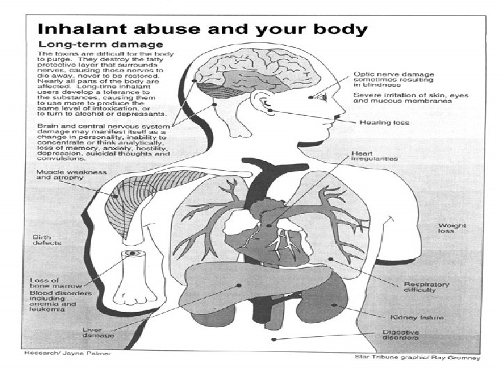 Inhalant Abuse: n n n n Irregular and rapid heart rate; heart failure Sudden sniffing death Asphyxiation, suffocation, convulsions, seizures, choking Trauma related to use Pulmonary damage and inability to ventilate. Organ failure Aggressive and violent behavior Withdrawal Symptoms: Insomnia, irritability, cramps, nausea, tremors, depression, headache, confusion, convulsions