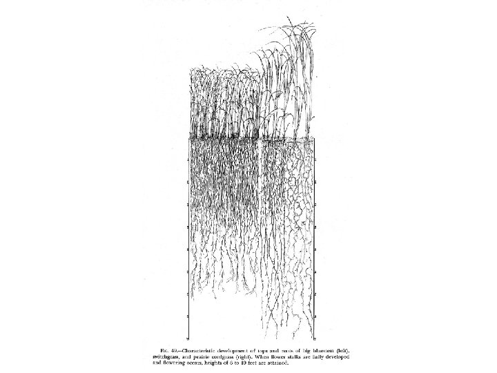 Prairie Productivity • In prairies 2 to 4 times the amount of aboveground biomass occurs as biomass below ground • Prairie plants produce extensive root systems - big bluestem roots reach down 2 m; switchgrass roots reach down 3. 7 m; forbs such as leadplant and dotted gayfeather have much deeper roots - reaching down 5 m • A student of Weaver's measured the length of root material in the top 10 cm of a 0. 5 square meter plot and found 21. 5 km of big bluestem root; 38. 7 km of little bluestem; 18. 3 km of needlegrass; 176. 7 km of Kentucky bluegrass