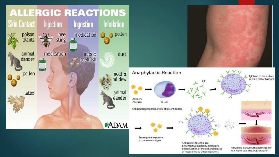 Allergies Allergies- when the immune system reacts to harmless antigens (allergens) such as pet dander, pollen, or dust. This triggers the inflammatory response, causing sneezing, watery, itchy eyes, etc. Antihistamines can counteract these symptoms. Allergic reactions in the respiratory system can create asthma.