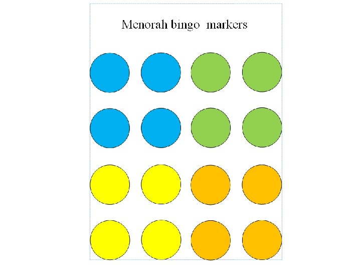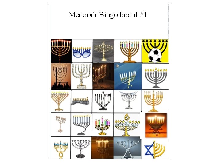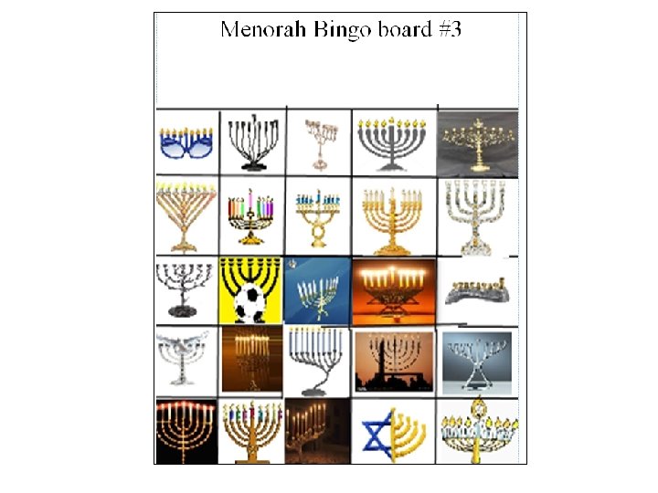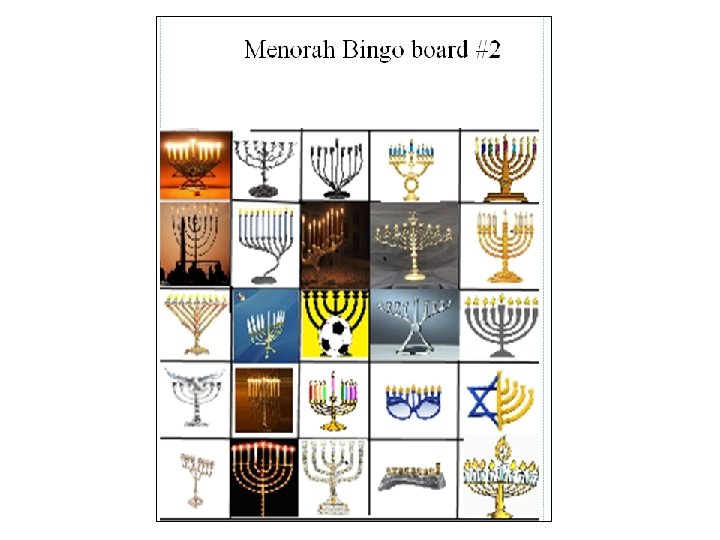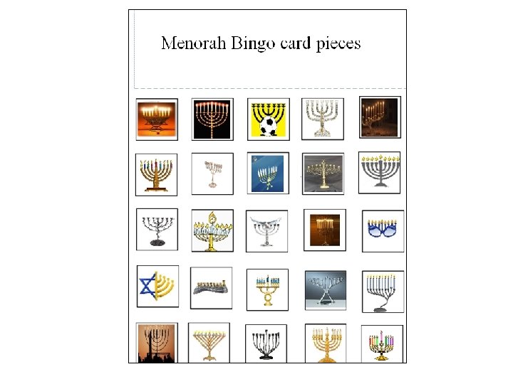 Menorah Bingo instructions. Cut out the bingo boards, the circles (use them as markers) and the card pieces. . Put the card pieces face down and mix them up. . Pick a piece from your pile and every one puts a marker on the picture that was picked. Whoever gets 5 in a row first wins! ENJOY!!! As we know, the Chabad Minhag is to light Menorahs with straight brances, and not round ones.