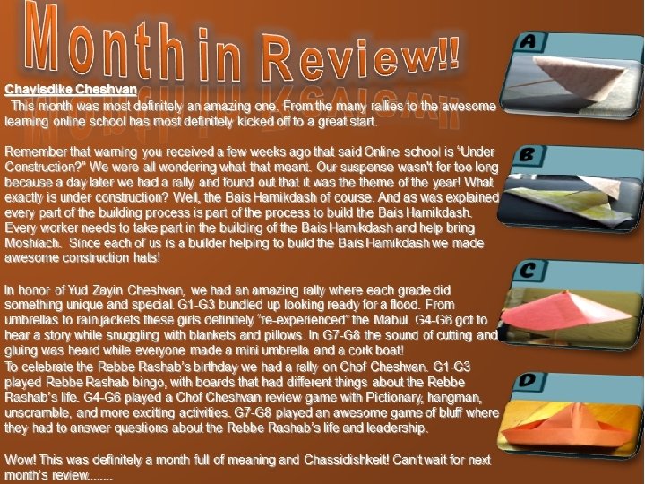 Pisgam "Aiza hu asher basamaich bichelko" (Who is rich, the one thats happy what he has) Picture of the Month Here is a collage of Yud Zayin Cheshvan pictures. Check it out on the Online School site – www. shluchimonlineschool. com then click “Extra. Curricular” then click “girls. ” Find yourself!