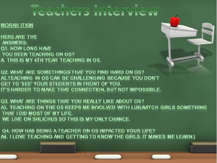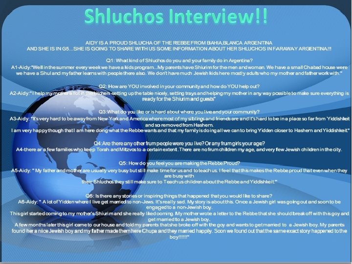 Hello! This is our reporter, Chana Shaina speaking, enough to get a report straight from G 2! Here it is: How many kids are in your class? 11 or 12 How many teachers do you have? Two What are their names? Morah Nechamie Browd and Morah lew. Where do you live? Mushka Pelman- Dominican Republic Devorah Leah Feigelstock- Paraguay What is your favorite subject? Mushka Tenenbaum-Everything! Yehudis Loschak-Parsha Mushka Schmerling-Dvar Torah Mushka Blesofsky-Chumash Mushka Lifshitz- Parsha, Kesiva, and Chumash Ita Zweibal-Everything Sara Chitrik-Chumash Batsheva Vogel-Parsha, Peirush Teffila, Kesiva, Yedios Klolios, and art at home Where do you live and what is your favorite part about living there? Fraidy Jacobson-I love the park here is Iowa ! Liba Gray-I love the library In New Hampshire! Chaya Simon- I love the library in Kingston, Ontario! THANK YOU G 2!!!!!