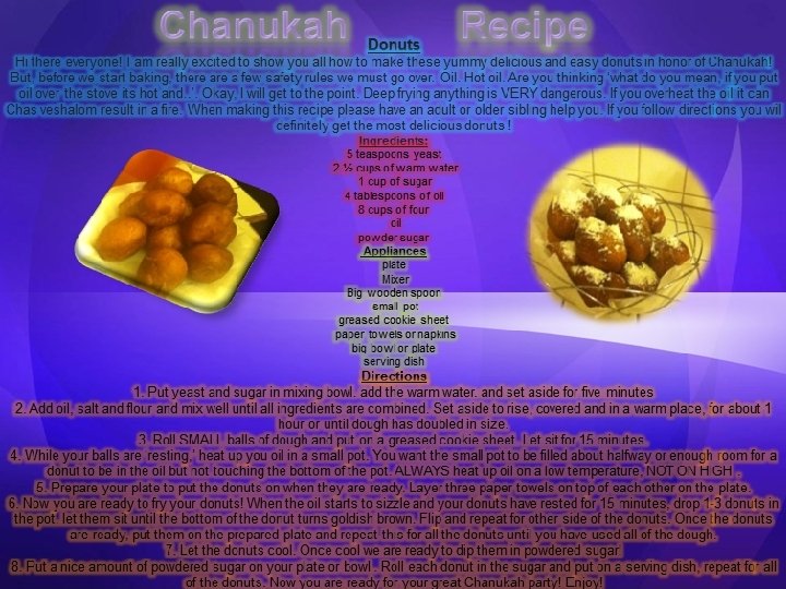 Illuminate Hey SOS! So the newsletter is finally here! We are soooo excited! After much hard work, meetings, and many e-mail back and forth, it’s here : ) This year we made a change with the newsletter. This year, the newsletter will be made in powerpoint- so you can WATCH the newsletter, not only read it! The month of Kislev is here. This month, we have a busy month! Chanukah is coming up, and everyone is probably so excited. I mean, who doesn’t love chanukah? Between the food, the games, the songs and the fun, it’s pretty hard not to love chanukah. But in between all the fun and games, we should all remember that we are like the chanukah menorah, spreading light to the darkness around us. It’s up to us to spread the light and bring Moshiach NOW!! -- Mushka Goldman, Editor In Chief Newslette# Kislev Edition 1