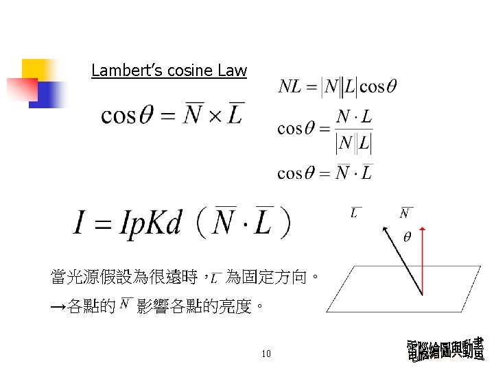 Diffuse Reflection(光線在物體法向量方向的分量) I:物體面上一點的Intensity(亮度) Ip:Intensity of point light source Kd:Material’s diffuse-reflection coefficient 每種材質不同(0~1) 完全吸光線 = 0 :angle between and :Surface Normal(unit vector) :Light Source Direction(unit vector) 9