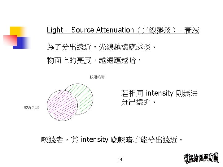 計算一個 Surface 上各點Pixel的亮度 1. Surface 定義 → Pixels 2. 計算每一個 pixel 點位置,在幾何上的Surface Normal 3. 決定 Light Source 4. 計算各點 5. 找到 Surface 的 Kd(與材質有關) 6. 決定 IP(intensity and scolor) 7. 決定 I(intensity and color) 13