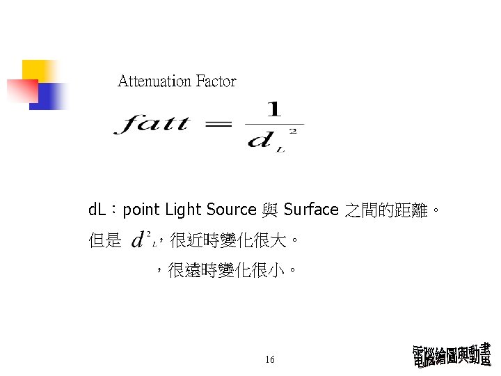 Light – Source Attenuation factor fatt:attenuation factor 由 Light source 及 surface 之間距離決定。 15