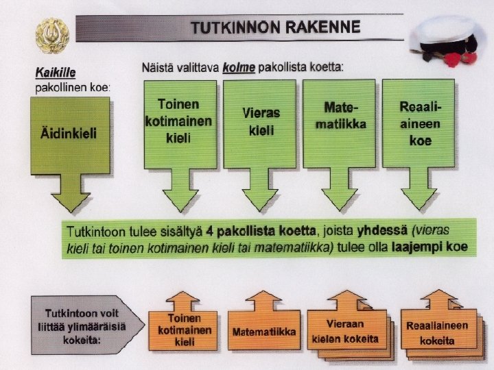 Yo-tutkintoasetuksesta TUTKINNON RAKENNE KAIKILLE PAKOLLINEN n ÄIDINKIELI KOLME PAKOLLISTA KOETTA VALITTAVA SEURAAVISTA: n TOINEN KOTIMAINEN KIELI (RUOTSI) n VIERAS KIELI n MATEMATIIKKA TAI n REAALIAINEEN KOE