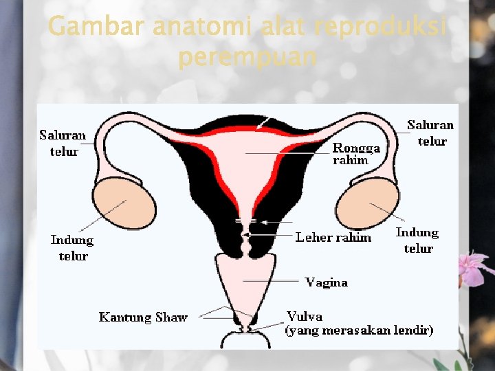 � � Leher rahim (cervix), yang merupakan penghubung antara vagina dan rahim. Rahim (uterus), tempat dimana sel telur yang sudah dibuahi tumbuh dalam rahim selama kehamilan. Bila telur tidak dibuahi, maka sel telur menempel ke dinding rahim. Selanjutnya dinding rahim menebal lalu luruh dan mengalir keluar dalam bentuk darah. Inilah yang disebut haid (menstruasi). Saluran telur (tuba falopii), yaitu dua saluran yang terletak sebelah kanana dan kiri rahim yang berfungsi sebagai penghubung rongga rahim dan indung telur. Dua buah indung telur ( ovarium), berfungsi memproduksi sel telur dan hormon peremputan yaitu estrogen dan progesterone. Atas pengaruh hormon, sebanyak satu sampai dua sel telur masak setiap bulan , lalu dilepaskan ke dinding rahim. Dinding rahim ini akan menebal, yang sebetulnya berguna sebagai tempat sel telur bersarang setelah dibuahi.