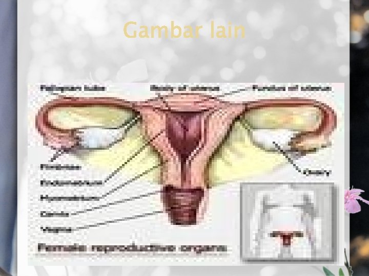 Fungsi : � � � 1. Ovarium � Berjumlah sepasang dan berbentuk oval seukuran kacang. � Mengandung ribuan folikel (5000 -200. 000 buah) yang tiap folikel mengandung 1 ovum. 2. Saluran Kelamin � Menghubungkan ovarium ke uterus � Terdiri dari berturut-turut : Fimbria, tuba falopi, uterus (rahim), dan vagina. 3. Kelenjar Kelamin (Asesoris) � Kelenjar Bartholin : menghasilkan cairan pelumas vagina