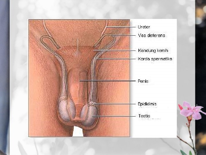 • • PENIS Merupakan jaringan erektil yang berfungsi untuk : - Deposit sperma dalam hubungan seksual sehingga dapat ditampung sebelum senggama. - Sebagai alat penting dalam hubungan seks baik untuk kreasi dan prokreasi. Struktur anatominya terdapat bagian yang disebut kapernous yang dapat membesarkan dan memberi ketegangan pada penis TESTIS Disebut juga buah zakar. Testis berada di luar yang dibungkus dengan skrotum yang longgar. Merupakan alat penting untuk membentuk hormon pria yaitu testosteron dan membentuk spermatozoa yaitu bibit dari pria dalam jumlah besar. Spermatozoa yang telah dibentuk disimpan pada saluran testis untuk ditampungnya karena spermatozoa tidak tahan panas dan tidak tahan suhu terlalu dingin. Kulit skrotum yang longgar digunakan untuk mengatur suhu sehingga panas di sekitar spermatozoa relatif tetap.