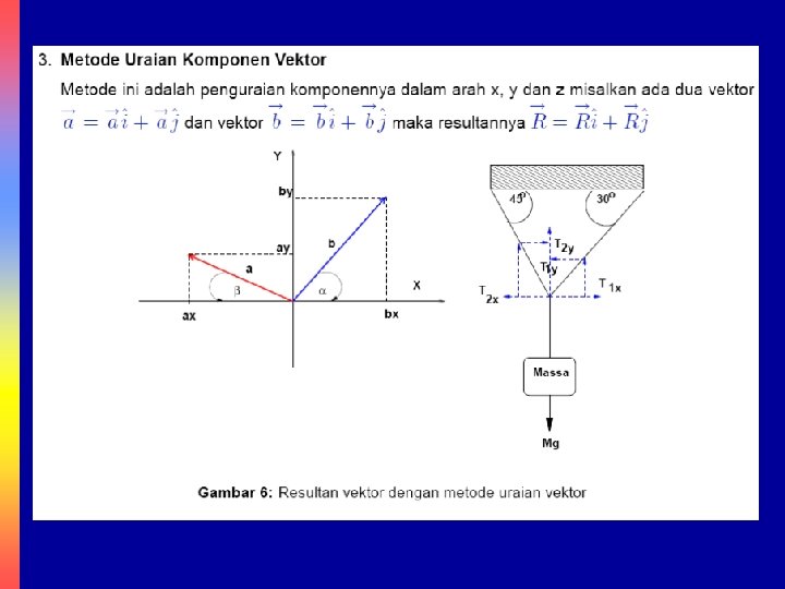 SOAL - SOAL : Tiga buah gaya yang bekerja pada sebuah partikel dinyatakan sebagai berikut F 1=20 i-36 j +73 k N, F 2=-17 i+21 j-46 k N, dan F 3 =-12 k N. Carilah resultannya dalam bentuk komponen. Cari juga besarnya resultan tersebut. Penyelesaian ! 5. Bila A=-12 i+25 j+13 k dan B=-3 j+7 k, berapakah resultannya bila A dikurangi dari B. Penyelesaian ! 6. Gaya 100 N membentuk sudut dengan sumbu x, dan komponen y-nya adalah 30 N. Tentukan komponen x gaya itu; tentukan pula . Penyelesaian ! 4.