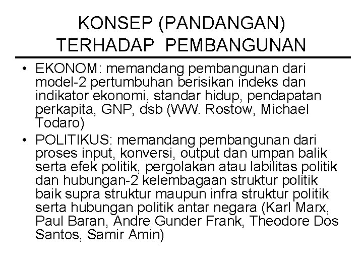 KONSEP (PANDANGAN) TERHADAP PEMBANGUNAN • EKONOM: memandang pembangunan dari model-2 pertumbuhan berisikan indeks dan indikator ekonomi, standar hidup, pendapatan perkapita, GNP, dsb (WW. Rostow, Michael Todaro) • POLITIKUS: memandang pembangunan dari proses input, konversi, output dan umpan balik serta efek politik, pergolakan atau labilitas politik dan hubungan-2 kelembagaan struktur politik baik supra struktur maupun infra struktur politik serta hubungan politik antar negara (Karl Marx, Paul Baran, Andre Gunder Frank, Theodore Dos Santos, Samir Amin)