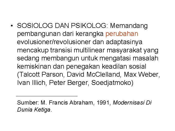 • SOSIOLOG DAN PSIKOLOG: Memandang pembangunan dari kerangka perubahan evolusioner/revolusioner dan adaptasinya mencakup transisi multilinear masyarakat yang sedang membangun untuk mengatasi masalah kemiskinan dan penegakan keadilan sosial (Talcott Parson, David Mc. Clelland, Max Weber, Ivan Illich, Peter Berger, Soedjatmoko) Sumber: M. Francis Abraham, 1991, Modernisasi Di Dunia Ketiga.