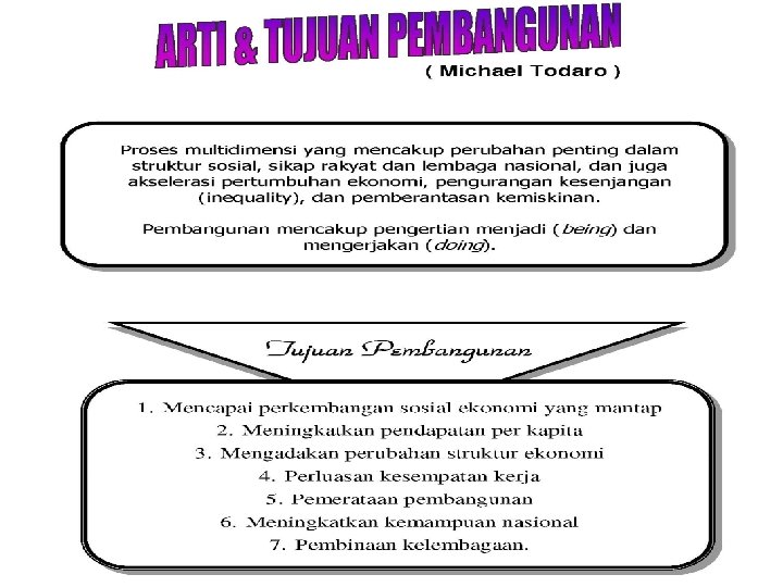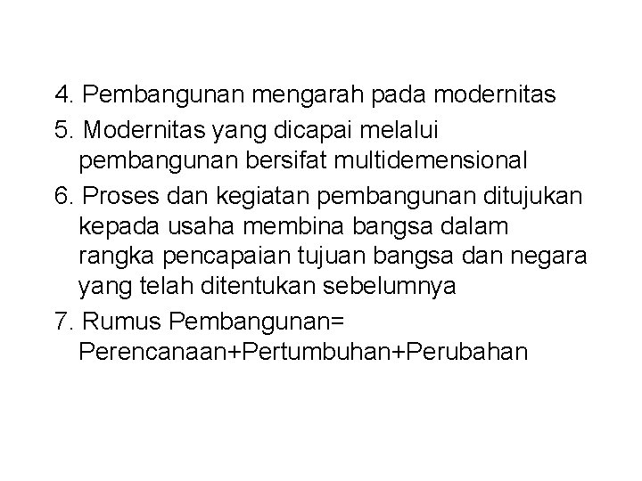 4. Pembangunan mengarah pada modernitas 5. Modernitas yang dicapai melalui pembangunan bersifat multidemensional 6. Proses dan kegiatan pembangunan ditujukan kepada usaha membina bangsa dalam rangka pencapaian tujuan bangsa dan negara yang telah ditentukan sebelumnya 7. Rumus Pembangunan= Perencanaan+Pertumbuhan+Perubahan
