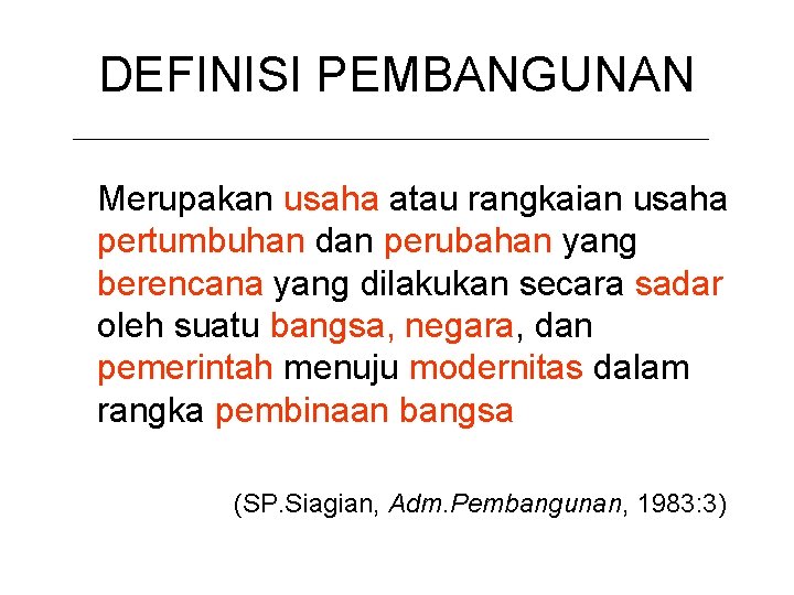 DEFINISI PEMBANGUNAN Merupakan usaha atau rangkaian usaha pertumbuhan dan perubahan yang berencana yang dilakukan secara sadar oleh suatu bangsa, negara, dan pemerintah menuju modernitas dalam rangka pembinaan bangsa (SP. Siagian, Adm. Pembangunan, 1983: 3)