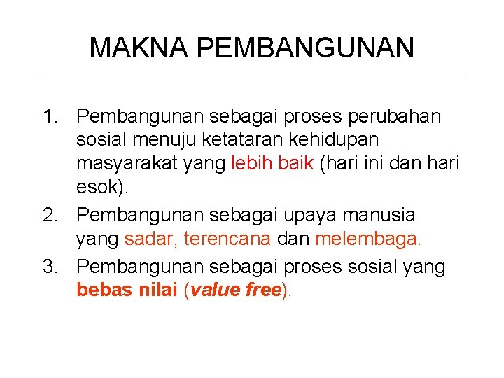 MAKNA PEMBANGUNAN 1. Pembangunan sebagai proses perubahan sosial menuju ketataran kehidupan masyarakat yang lebih baik (hari ini dan hari esok). 2. Pembangunan sebagai upaya manusia yang sadar, terencana dan melembaga. 3. Pembangunan sebagai proses sosial yang bebas nilai (value free).