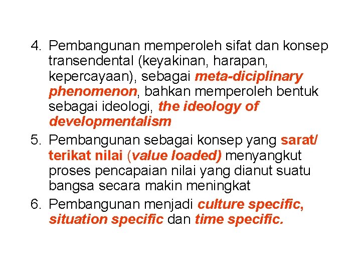 4. Pembangunan memperoleh sifat dan konsep transendental (keyakinan, harapan, kepercayaan), sebagai meta-diciplinary phenomenon, bahkan memperoleh bentuk sebagai ideologi, the ideology of developmentalism 5. Pembangunan sebagai konsep yang sarat/ terikat nilai (value loaded) menyangkut proses pencapaian nilai yang dianut suatu bangsa secara makin meningkat 6. Pembangunan menjadi culture specific, situation specific dan time specific.