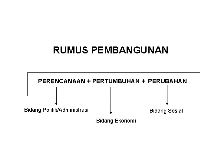 RUMUS PEMBANGUNAN PERENCANAAN + PERTUMBUHAN + PERUBAHAN Bidang Politik/Administrasi Bidang Sosial Bidang Ekonomi