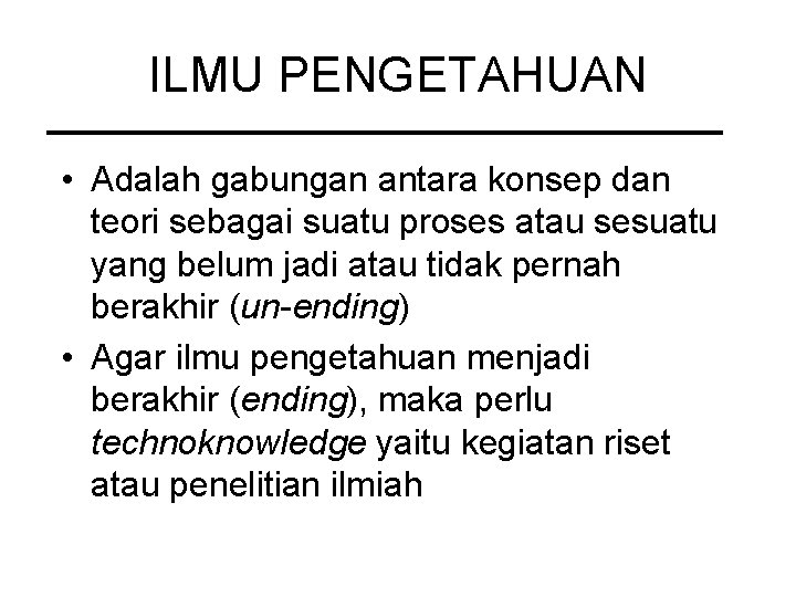 ILMU PENGETAHUAN • Adalah gabungan antara konsep dan teori sebagai suatu proses atau sesuatu yang belum jadi atau tidak pernah berakhir (un-ending) • Agar ilmu pengetahuan menjadi berakhir (ending), maka perlu technoknowledge yaitu kegiatan riset atau penelitian ilmiah