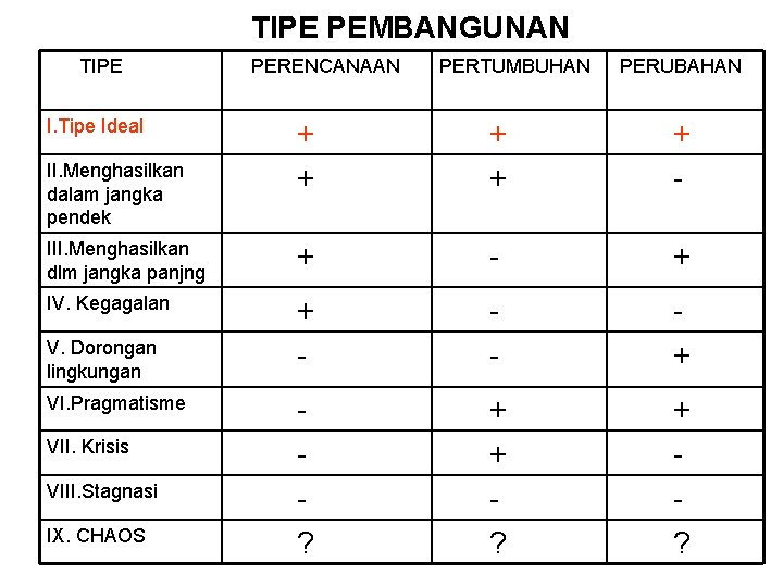 TIPE PEMBANGUNAN TIPE I. Tipe Ideal PERENCANAAN PERTUMBUHAN PERUBAHAN + + + - III. Menghasilkan dlm jangka panjng + - + IV. Kegagalan + - - + ? II. Menghasilkan dalam jangka pendek V. Dorongan lingkungan VI. Pragmatisme VII. Krisis VIII. Stagnasi IX. CHAOS
