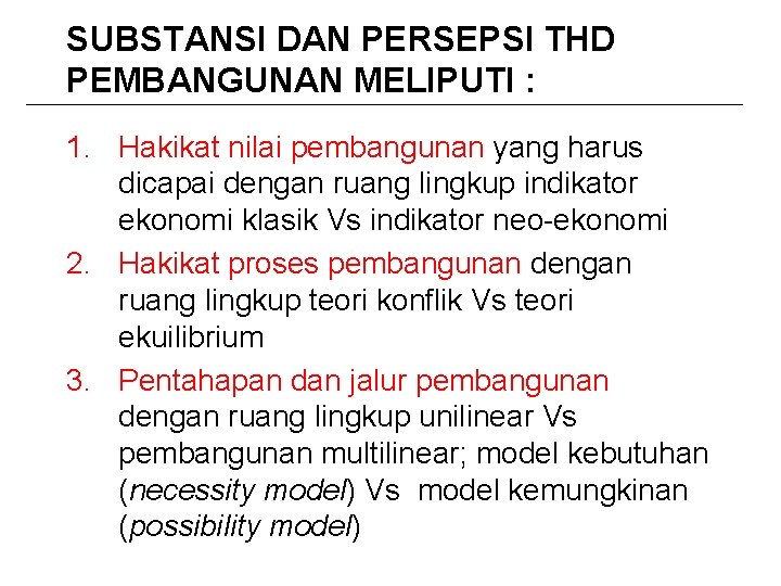 SUBSTANSI DAN PERSEPSI THD PEMBANGUNAN MELIPUTI : 1. Hakikat nilai pembangunan yang harus dicapai dengan ruang lingkup indikator ekonomi klasik Vs indikator neo-ekonomi 2. Hakikat proses pembangunan dengan ruang lingkup teori konflik Vs teori ekuilibrium 3. Pentahapan dan jalur pembangunan dengan ruang lingkup unilinear Vs pembangunan multilinear; model kebutuhan (necessity model) Vs model kemungkinan (possibility model)