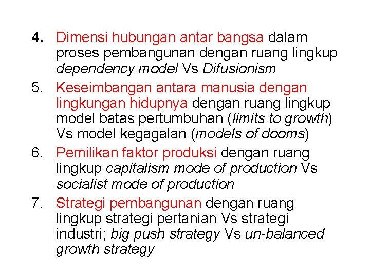 4. Dimensi hubungan antar bangsa dalam proses pembangunan dengan ruang lingkup dependency model Vs Difusionism 5. Keseimbangan antara manusia dengan lingkungan hidupnya dengan ruang lingkup model batas pertumbuhan (limits to growth) Vs model kegagalan (models of dooms) 6. Pemilikan faktor produksi dengan ruang lingkup capitalism mode of production Vs socialist mode of production 7. Strategi pembangunan dengan ruang lingkup strategi pertanian Vs strategi industri; big push strategy Vs un-balanced growth strategy