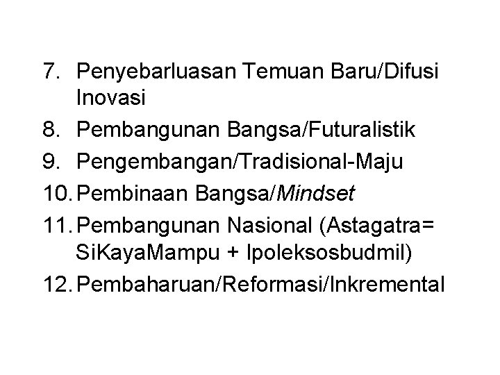 7. Penyebarluasan Temuan Baru/Difusi Inovasi 8. Pembangunan Bangsa/Futuralistik 9. Pengembangan/Tradisional-Maju 10. Pembinaan Bangsa/Mindset 11. Pembangunan Nasional (Astagatra= Si. Kaya. Mampu + Ipoleksosbudmil) 12. Pembaharuan/Reformasi/Inkremental