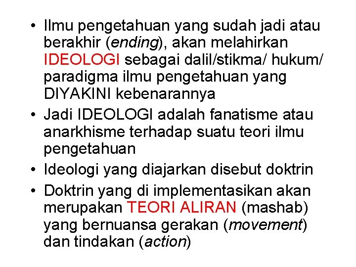 • Ilmu pengetahuan yang sudah jadi atau berakhir (ending), akan melahirkan IDEOLOGI sebagai dalil/stikma/ hukum/ paradigma ilmu pengetahuan yang DIYAKINI kebenarannya • Jadi IDEOLOGI adalah fanatisme atau anarkhisme terhadap suatu teori ilmu pengetahuan • Ideologi yang diajarkan disebut doktrin • Doktrin yang di implementasikan akan merupakan TEORI ALIRAN (mashab) yang bernuansa gerakan (movement) dan tindakan (action)