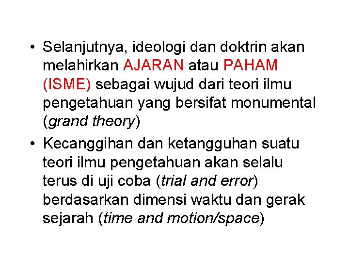 • Selanjutnya, ideologi dan doktrin akan melahirkan AJARAN atau PAHAM (ISME) sebagai wujud dari teori ilmu pengetahuan yang bersifat monumental (grand theory) • Kecanggihan dan ketangguhan suatu teori ilmu pengetahuan akan selalu terus di uji coba (trial and error) berdasarkan dimensi waktu dan gerak sejarah (time and motion/space)