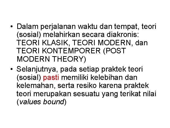 • Dalam perjalanan waktu dan tempat, teori (sosial) melahirkan secara diakronis: TEORI KLASIK, TEORI MODERN, dan TEORI KONTEMPORER (POST MODERN THEORY) • Selanjutnya, pada setiap praktek teori (sosial) pasti memiliki kelebihan dan kelemahan, serta resiko karena praktek teori merupakan sesuatu yang terikat nilai (values bound)