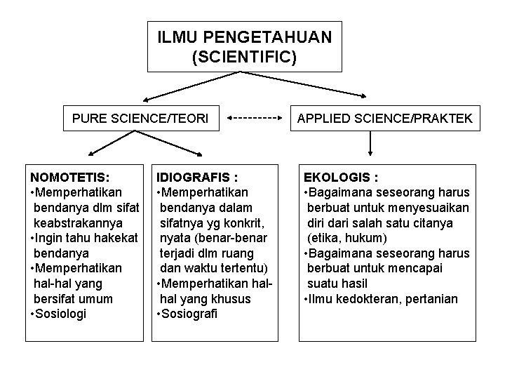 ILMU PENGETAHUAN (SCIENTIFIC) PURE SCIENCE/TEORI NOMOTETIS: • Memperhatikan bendanya dlm sifat keabstrakannya • Ingin tahu hakekat bendanya • Memperhatikan hal-hal yang bersifat umum • Sosiologi IDIOGRAFIS : • Memperhatikan bendanya dalam sifatnya yg konkrit, nyata (benar-benar terjadi dlm ruang dan waktu tertentu) • Memperhatikan halhal yang khusus • Sosiografi APPLIED SCIENCE/PRAKTEK EKOLOGIS : • Bagaimana seseorang harus berbuat untuk menyesuaikan diri dari salah satu citanya (etika, hukum) • Bagaimana seseorang harus berbuat untuk mencapai suatu hasil • Ilmu kedokteran, pertanian