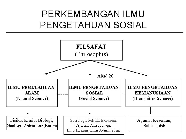 PERKEMBANGAN ILMU PENGETAHUAN SOSIAL FILSAFAT (Philosophis) Abad 20 ILMU PEGETAHUAN ALAM (Natural Science) ILMU PENGETAHUAN SOSIAL (Social Science) Fisika, Kimia, Biologi, Geologi, Astronomi, Botani Sosiologi, Politik, Ekonomi, Sejarah, Antropologi, Ilmu Hukum, Ilmu Administrasi ILMU PENGETAHUAN KEMANUSIAAN (Humanities Science) Agama, Kesenian, Bahasa, dsb