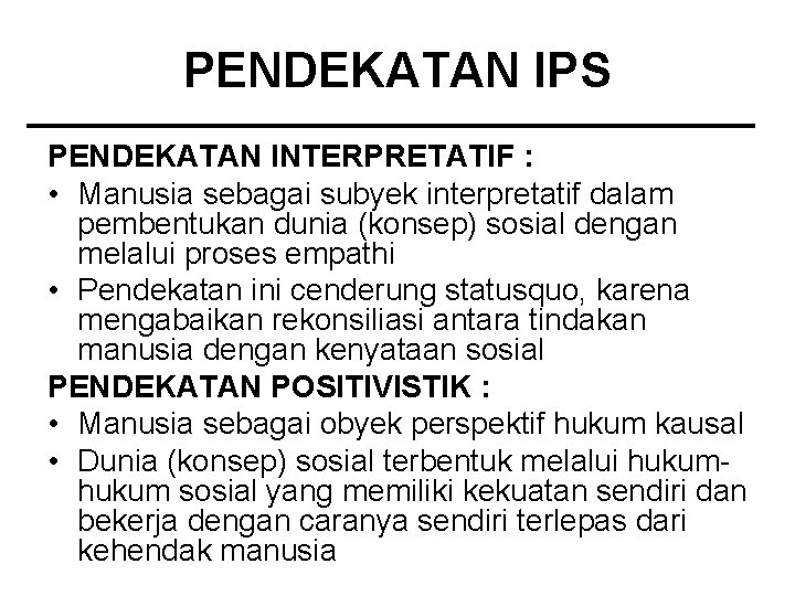 PENDEKATAN IPS PENDEKATAN INTERPRETATIF : • Manusia sebagai subyek interpretatif dalam pembentukan dunia (konsep) sosial dengan melalui proses empathi • Pendekatan ini cenderung statusquo, karena mengabaikan rekonsiliasi antara tindakan manusia dengan kenyataan sosial PENDEKATAN POSITIVISTIK : • Manusia sebagai obyek perspektif hukum kausal • Dunia (konsep) sosial terbentuk melalui hukum sosial yang memiliki kekuatan sendiri dan bekerja dengan caranya sendiri terlepas dari kehendak manusia