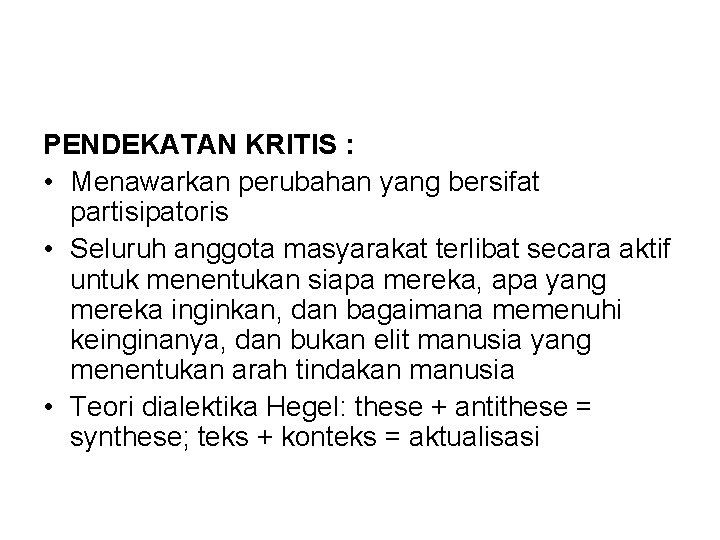 PENDEKATAN KRITIS : • Menawarkan perubahan yang bersifat partisipatoris • Seluruh anggota masyarakat terlibat secara aktif untuk menentukan siapa mereka, apa yang mereka inginkan, dan bagaimana memenuhi keinginanya, dan bukan elit manusia yang menentukan arah tindakan manusia • Teori dialektika Hegel: these + antithese = synthese; teks + konteks = aktualisasi