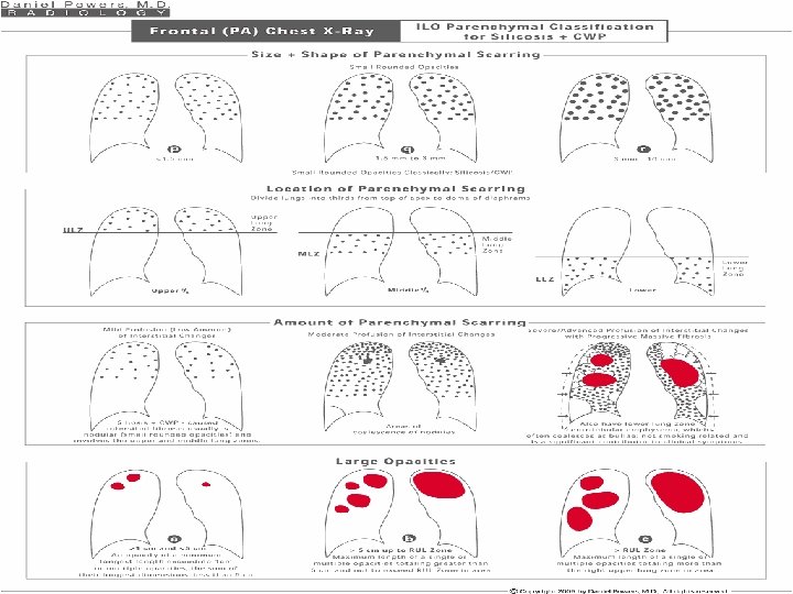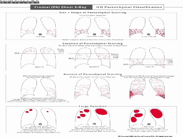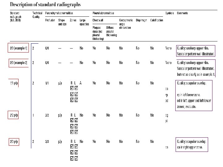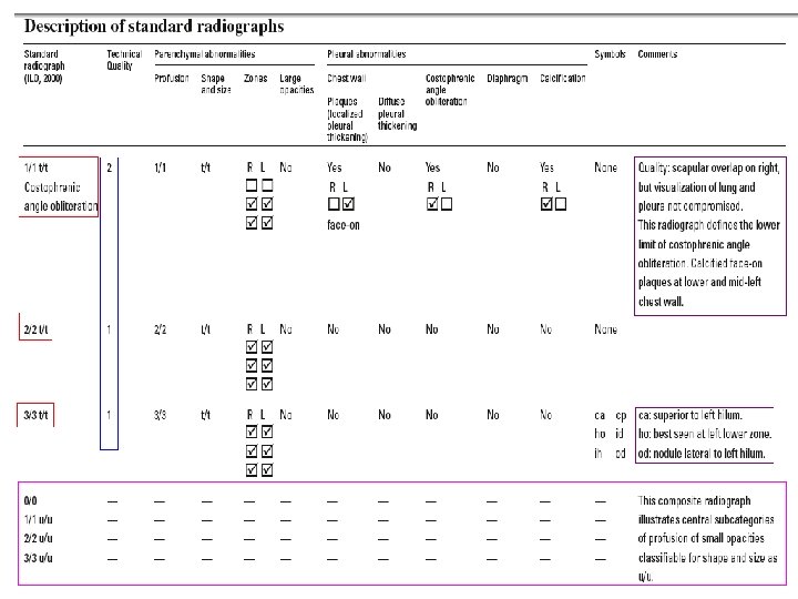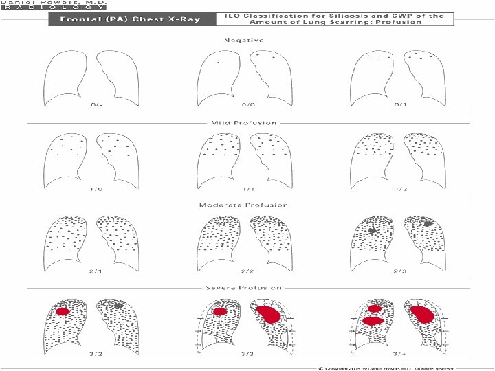 • PROFUSION : ü 4 categories : 0, 1, 2, 3 ü 12 subcategories : 0/-, 0/0, 0/1 1/0, 1/1, 1/2 2/1, 2/2, 2/3 3/2, 3/3, 3/+ ü Cat 0 refers to absence of small opacities & cat 3 to highest profusion. ü Compared with standard radiographs 0/0, 1/1, 2/2 & 3/3.