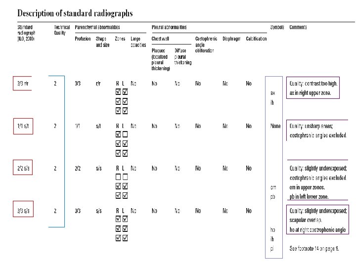 • To classify the chest radiograph of a dust exposed individual, 4 main points are to be considered. 1. Technical quality 2. Parenchymal abnormalities 3. Pleural abnormalities 4. Symbols or other abnormalities