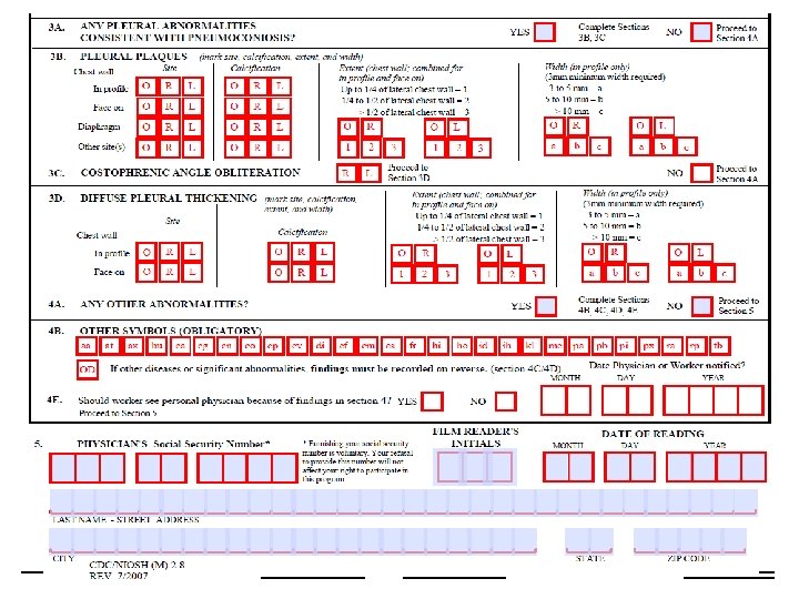 OBJECT OF CLASSIFICATION • To codify the radiographic abnormalities of the pneumoconioses in a simple, systematic and reproducible manner. • Neither defines pathological entities nor takes into account working capacity