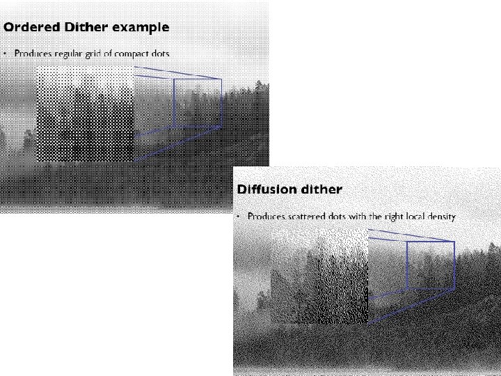 Dithering n Distribute errors among pixels Ø Exploit spatial integration in our eye Ø Display greater range of perceptible intensities