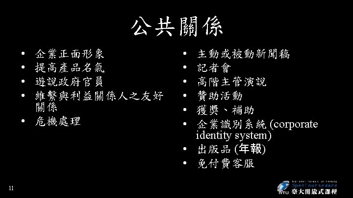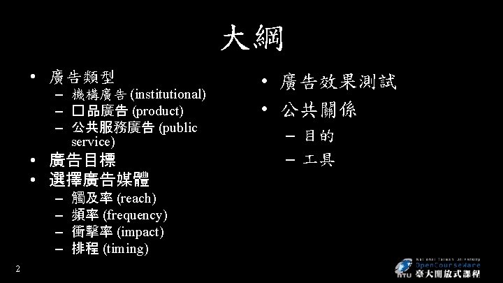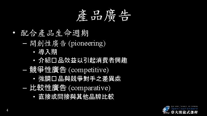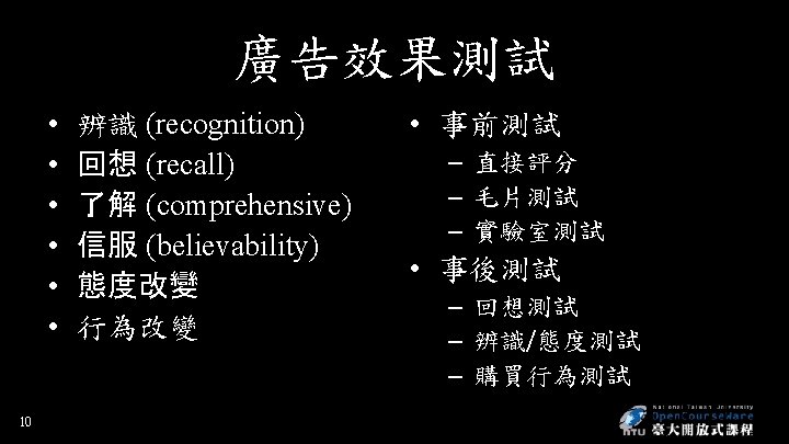 廣告策略 • 觀眾被動接收 • 互動電視、網路 • Creative concept - distinctive, memorable – Meaningful, believable, distinctive • Madison & Vine - the intersection of Madison Avenue and Hollywood – Advertainment • 7 Product-placement advertising
