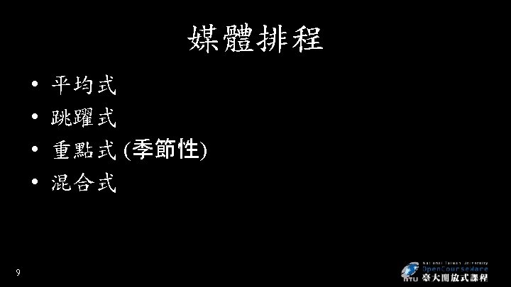 選擇廣告媒體 • 觸及率 (Reach is a measure of the percentage of people in the target market who are exposed to the ad campaign during a given period of time) • 頻率 (Frequency is a measure of how many times the average person in the target market is exposed to the message) • 衝擊率 (Impact is the qualitative value of a message exposure through a given medium) • 毛評點 (gross rating point= R x F ) • 每千人成本 (cost per thousand persons reached, CPM= 廣告成本 x 1000/接觸到廣告人數) 8