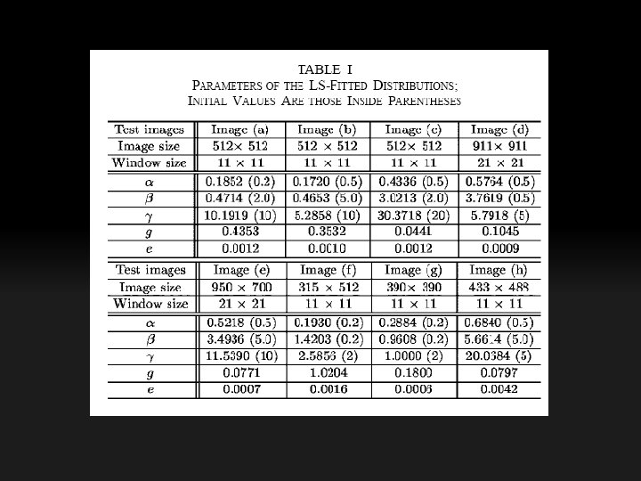 • We have performed some experiments to evaluate this. We chose eight typical images used in general and medical image processing. • We first computed the LSD histograms of these images. • For each image, we used the least-squares (LS) method to fit the LSD histograms. • Assume that the LSD has been quantized into m+1 levels.