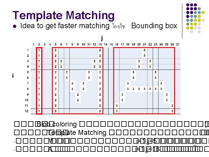 Template Matching l Idea to get faster matching โดยใช Aspect Ratio l เกบอตราสวน (Aspect Ratio) ของ Template แยกตามกลม โดยเกบเปน width / height หรอ width และ height กได 1 12 Ratio = 0. 833 w = 1, h = 12 11 9 12 12 Ratio = 0. 75 w = 9, h = 12 Ratio = 0. 917 w = 11, h = 12 12