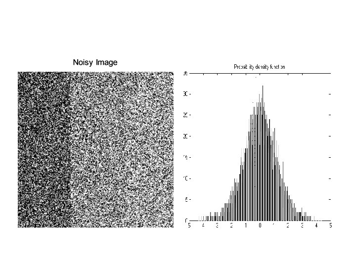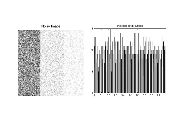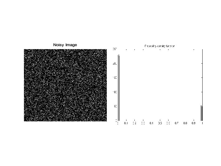 % Salt & pepper noise % Read a gray scale image (having few regulat patterns) and add salt & % pepper noise of certain mean value, standard deviation and certain percentage. % plot the histogram of noise, noisy image. ensure that the profile of the % noise is visible in the profile of the noisy image. clear all; close all; clc; %a = imread('pattern. png'); a = zeros([256, 256]); a = im 2 double(a); size. A = size(a); p 3 = 0. 3; b = a; x = rand(size. A); b(x < p 3/2) = 0; % Minimum value b(x >= p 3/2 & x < p 3) = 1; % Maximum (saturated) value figure, imshow(a); figure, imshow(b), title('Noisy Image'); figure, hist(b, 50), title('Probability density function');