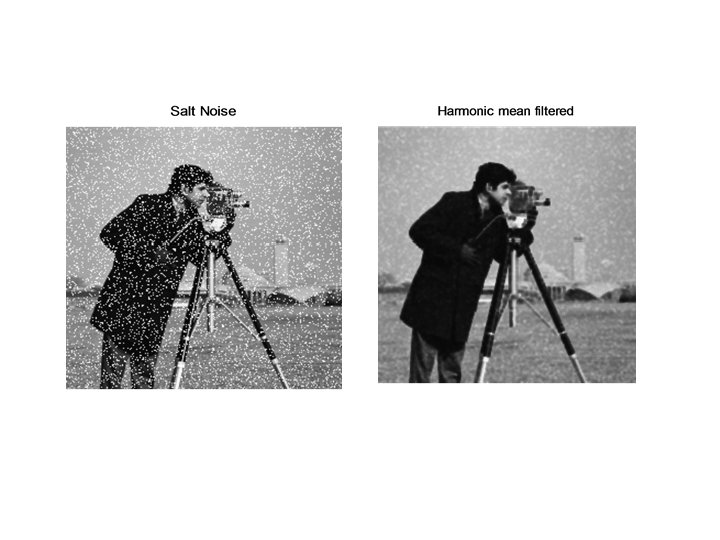 % Harmonic mean filter % Read a gray scale image and add a noise to it and filter it using % Harmonic mean filter. clear all; close all; clc; f = imread('Saltcman. tif'); %f = imnoise(f, 'gaussian', 0, 0. 02); f = im 2 double(f); %subplot(1, 2, 1), imshow(f), title('Original Image'); figure, imshow(f), title('Salt Noise'); [m n]=size(f); for i = 2: m-1 for j = 2: n-1 con=0; s 1=0; for k 1 = i-1: i+1 for p 1 = j-1: j+1 con = con+1; if f(k 1, p 1)==0 s 1 = s 1+0; else s 1=s 1+(1/f(k 1, p 1)); end end b 1(i, j)=con/s 1; end %subplot(1, 2, 2), imshow(b 1), title('Harmonic mean filtered'); figure, imshow(b 1), title('Harmonic mean filtered');