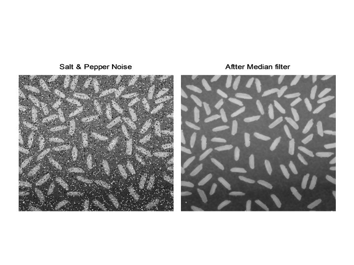 Impulse Noise • Noise impulses can be positive or negative. • Generally impulse corruption is large compared to the strength of image signal and hence are treated as extreme (black or white) values. • Negative impulses appear s black (pepper) points. • Positive impulses appear white (salt) noise. • For an 8 bit image a = 0 (black) and b = 255 (white).