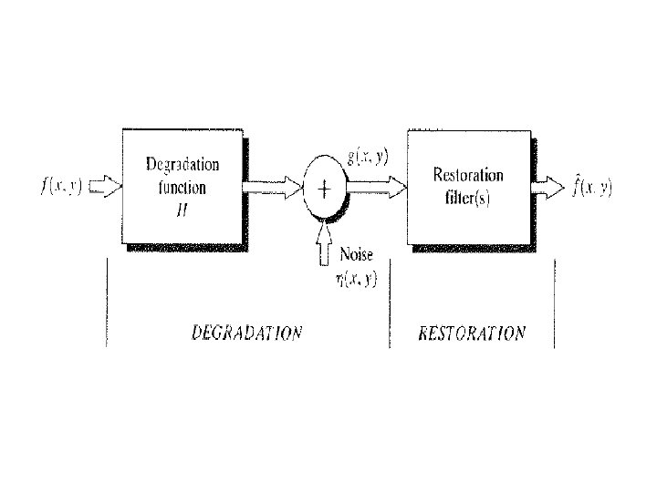 Model of Image Degradation / Restoration Process • In this model, we assume that there is an additive noise term, operating on an input image f(x, y) to produce a degraded image g(x, y). • Given g(x, y) and some information about degradation function H, and knowledge about noise term η(x, y). • The aim of restoration is to get an estimate f(x, y) of original image. • The more we know about H and term η, we get better results.