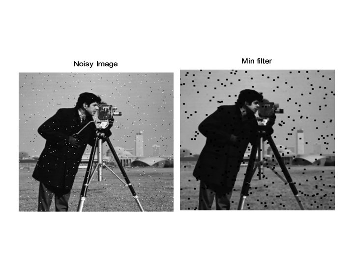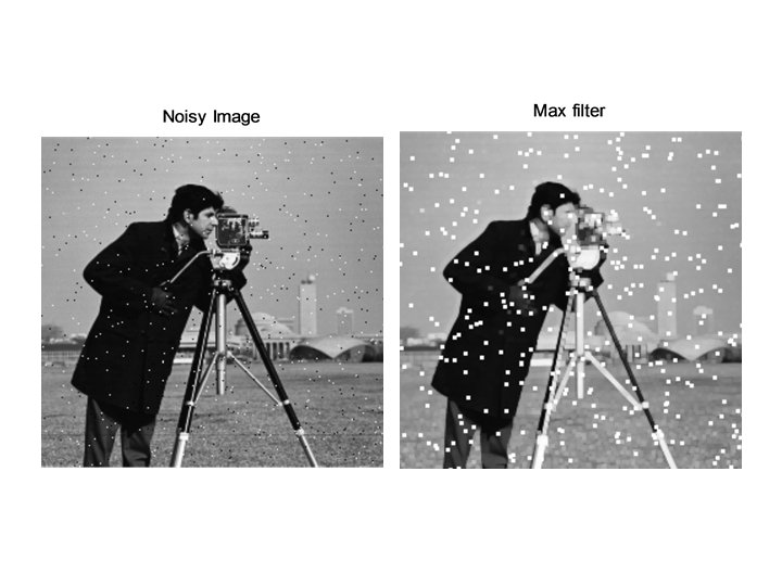 % Max and Min filters % Read a gray scale image and add salt & pepper noise and remove the same % with min filter and max filter. clear all; close all; clc; f = imread('cameraman. tif'); f = imnoise(f, 'salt & pepper', 0. 01); f = im 2 double(f); %subplot(2, 2, 1), imshow(f), title('Original Image'); figure, imshow(f), title('Noisy Image'); [m n]=size(f); Q=0; for i = 2: m-1 for j = 1: n-1 con=0; for k 1 = i-1: i+1 for p 1 = j-1: j+1 con = con+1; s 1(con)=(f(k 1, p 1)); end b 1(i, j)=min(s 1); b 2(i, j)=max(s 1); end %subplot(2, 2, 2), imshow(b 1), title('Min filter'); %subplot(2, 2, 3), imshow(b 2), title('Max filter'); figure, imshow(b 1), title('Min filter'); figure, imshow(b 2), title('Max filter');