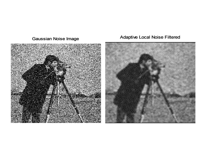 Behavior of a filter • Here if the estimate of ση 2 is too low, then the algorithm will return an image that resembles the original image as the correction factors are too small. • If the estimates are too high, the ratio of the variances need to be clipped at 1. 0 and the algorithm will subtract the man from the image more frequently than it would normally do so. • If negative values are permitted, the image is rescaled at the end and the result is a loss of dynamic range.